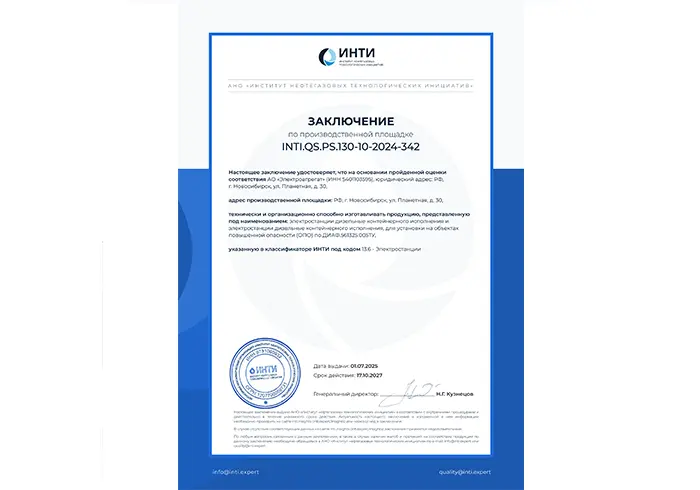 Автономная некоммерческая организация "Институт нефтегазовых технологических инициатив" за подписью генерального директора Н.Г Кузнецова выдала АО "Электроагрегат"  ЗАКЛЮЧЕНИЕ INTI.QS.PS.130-10-2024-342 по производственной площадке.